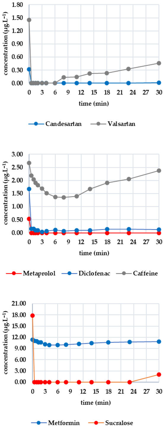 Figure 3 shows the evolution of the monitored analyte concentrations during GAC filtration. As irbesartan was not detected in the sample, it is not plotted in Figure 3. There was a sharp drop in the concentrations of candesartan and valsartan below the limit of detection after only 30 s. The initial concentrations were 0.324 μg·L−1 for candesartan and 1.455 μg·L−1 for valsartan. The valsartan concentration remained below the limit of detection until the sixth minute, after which it began to rise, reaching 0.456 μg·L−1 at the thirtieth minute. The candesartan concentration remained below the limit of detection for almost the entire time, with a slight increase to 0.015 μg·L−1 in the final sampling. For diclofenac (initial concentration: 1.672 μg·L−1), the concentration decreased to 0.063 μg·L−1 within eight minutes. After this, it increased slightly to 0.142 μg·L−1 at the 30th minute. The overall removal efficiency ranged from 90 to 98%. Metoprolol (initial concentration 0.531 μg·L−1) fell below the limit of detection after 30 s and remained below this value throughout. Caffeine (initial concentration 2.665 μg·L−1) decreased more slowly, reaching 1.348 μg·L−1 after eight minutes. However, the concentration subsequently increased again, reaching 2.372 μg·L−1 at minute 30. Sucralose (initial concentration 17.779 μg·L−1) fell below the limit of detection after 30 s and remained there until the 23rd minute. By the end of the experiment (minute 30), the concentration had risen to 2.040 μg·L−1. Metformin exhibited a more consistent pattern, with an initial concentration of 11.349 μg·L−1 decreasing most significantly at minute 4 to 9.945 μg·L−1 (a 12.37% decrease), followed by a slight increase to 10.867 μg·L−1 at minute 30.