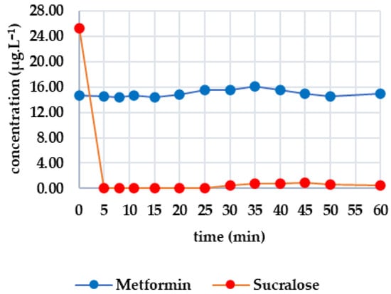 Five minutes of ozone exposure prior to GAC filtration was destructive, particularly for sucralose (decreasing from 27.367 to 21.690 μg·L−1) and diclofenac (decreasing from 2.907 to 1.270 μg·L−1). Caffeine, valsartan and candesartan also exhibited significant post-decreases. In contrast, irbesartan and metformin were unaffected by ozone. Metoprolol showed a minimal decrease, probably within the analytical error margin. Figure 5 shows how the analytes of interest evolved after column filtration. After the first sampling (at minute 5), a significant decrease was evident for candesartan and valsartan, almost reaching zero, except for irbesartan, which remained at 0.009 μg·L−1. Valsartan subsequently increased almost linearly to 0.705 μg·L−1 after 60 min; candesartan and irbesartan increased more slowly. Metoprolol fell to a concentration of zero as early as the fifth minute and remained below the limit of detection until the 60th minute. Diclofenac decreased from 1.270 μg·L−1 to 0.112 μg·L−1 within five minutes, after which the concentration remained stable. Caffeine followed a similar pattern, decreasing from 1.627 μg·L−1 to 0.102 μg·L−1 and subsequently falling below the detection limit from the eighth minute onwards. Sucralose dropped to almost zero after five minutes, then increased slowly to 3.907 μg·L−1 (minute 60). Metformin showed only a slight decrease, from 12.976 to 12.156 μg·L−1, during the first five minutes, followed by a slight increase to 11.999 μg·L−1 after 60 min.