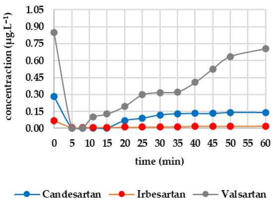 Figure 4 shows how the monitored analytes evolved after GAC filtration. There was a sharp drop below the limit of detection for candesartan, irbesartan and valsartan within the first five minutes. There was then a gradual increase: irbesartan increased to 0.009 μg·L−1 at minute 25, while candesartan increased to 0.065 μg·L−1 at minute 35. Valsartan showed the most significant increase, reaching 0.332 μg·L−1 at minute 60, compared to 0.109 μg·L−1 for candesartan and 0.013 μg·L−1 for irbesartan. The rate of re-ascent was consistent with the initial concentration levels. Both diclofenac and metoprolol fell below the limit of detection within five minutes and remained there until the end of the test (minute 60). Caffeine fell below the limit of detection after 35 min, with the concentration decreasing from 2.209 μg·L−1 to 0.593 μg·L−1 within 10 min and decreasing only slightly thereafter. After 50 min, there was a slight increase to 0.139 μg·L−1, and at 60 min, the concentration was determined to be 0.203 μg·L−1. Sucralose decreased below the limit of detection from an initial concentration of 25.265 µg/L at minute 5. A concentration of 0.506 μg·L−1 was recorded at minute 30, which continued to increase until minute 45. After this, it decreased slightly to 0.437 μg·L−1 (minute 60). Metformin remained stable throughout, with concentrations ranging from 15.800 to 14.300 μg·L−1.