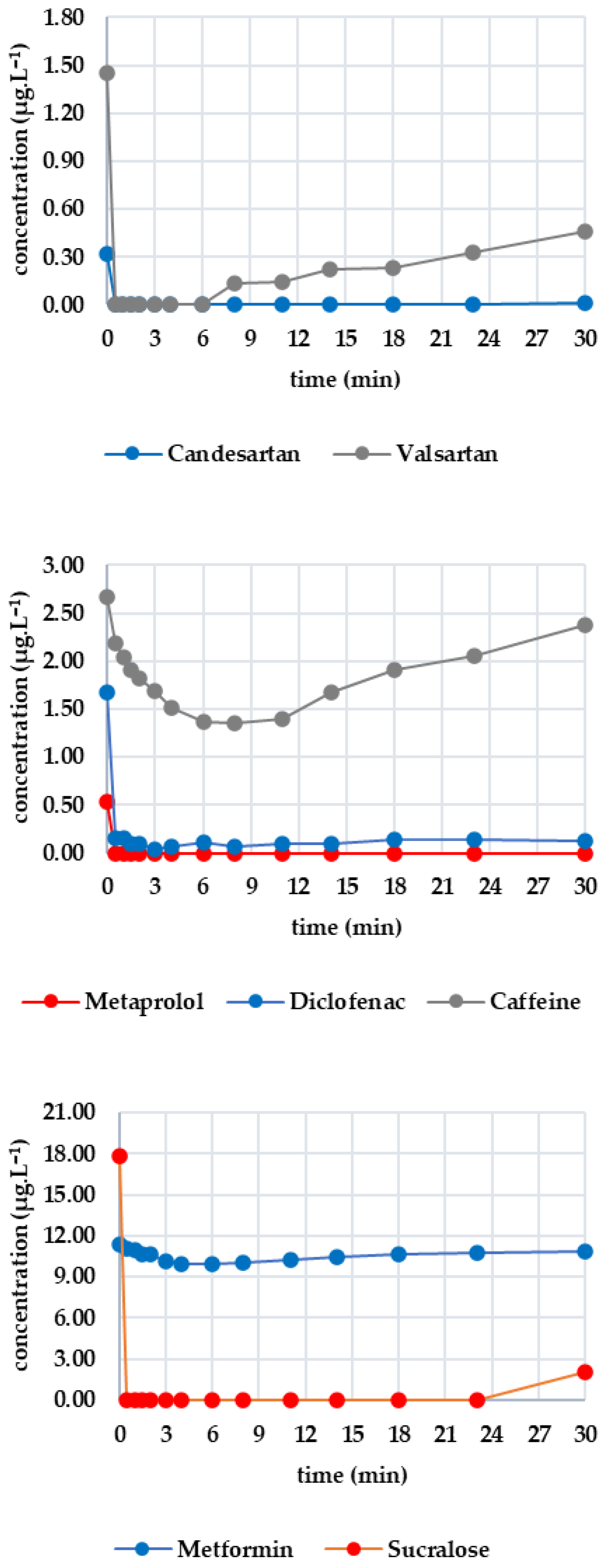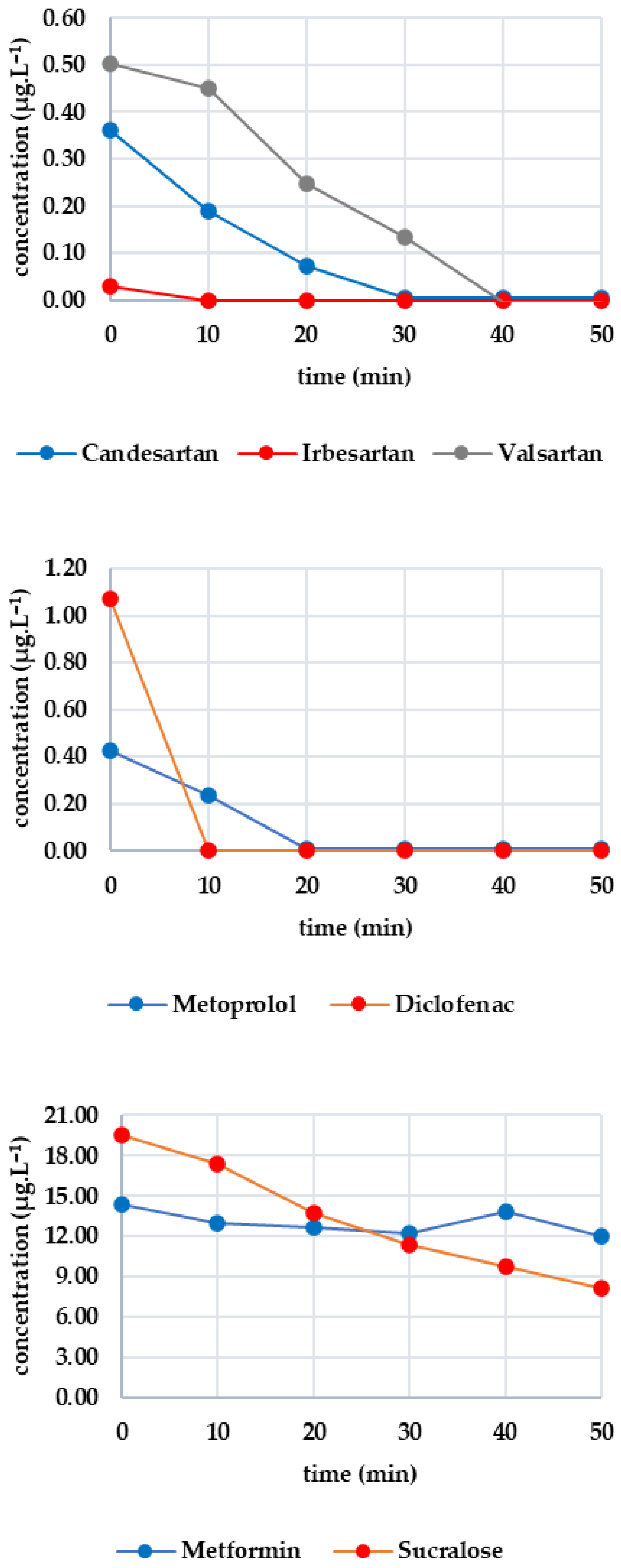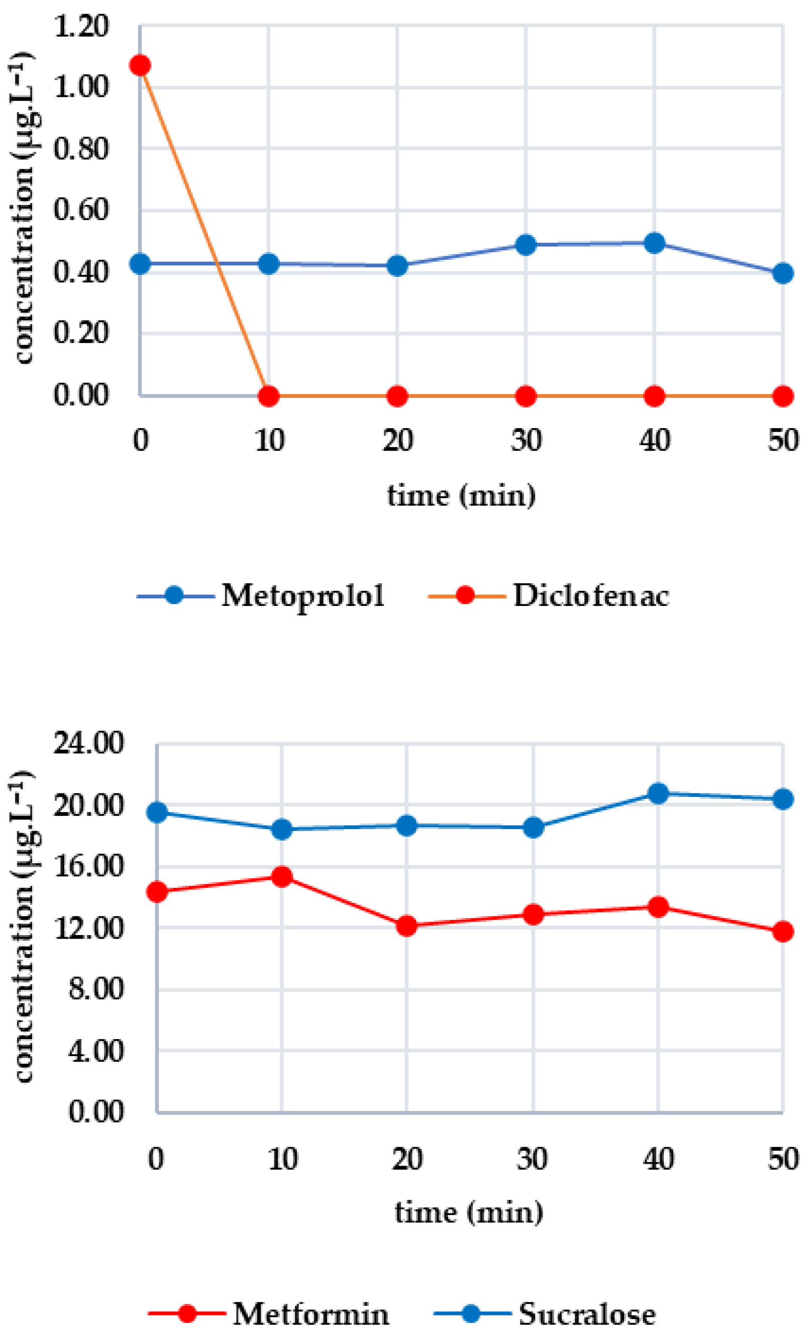 - Gagnon, C.; Lajeunesse, A.; Cejka, P.; Gagné, F.; Hausler, R. Degradation of Selected Acidic and Neutral Pharmaceutical Products in a Primary-Treated Wastewater by Disinfection Processes. Ozone Sci. Eng. 2008, 30, 387–392. [Google Scholar] [CrossRef]