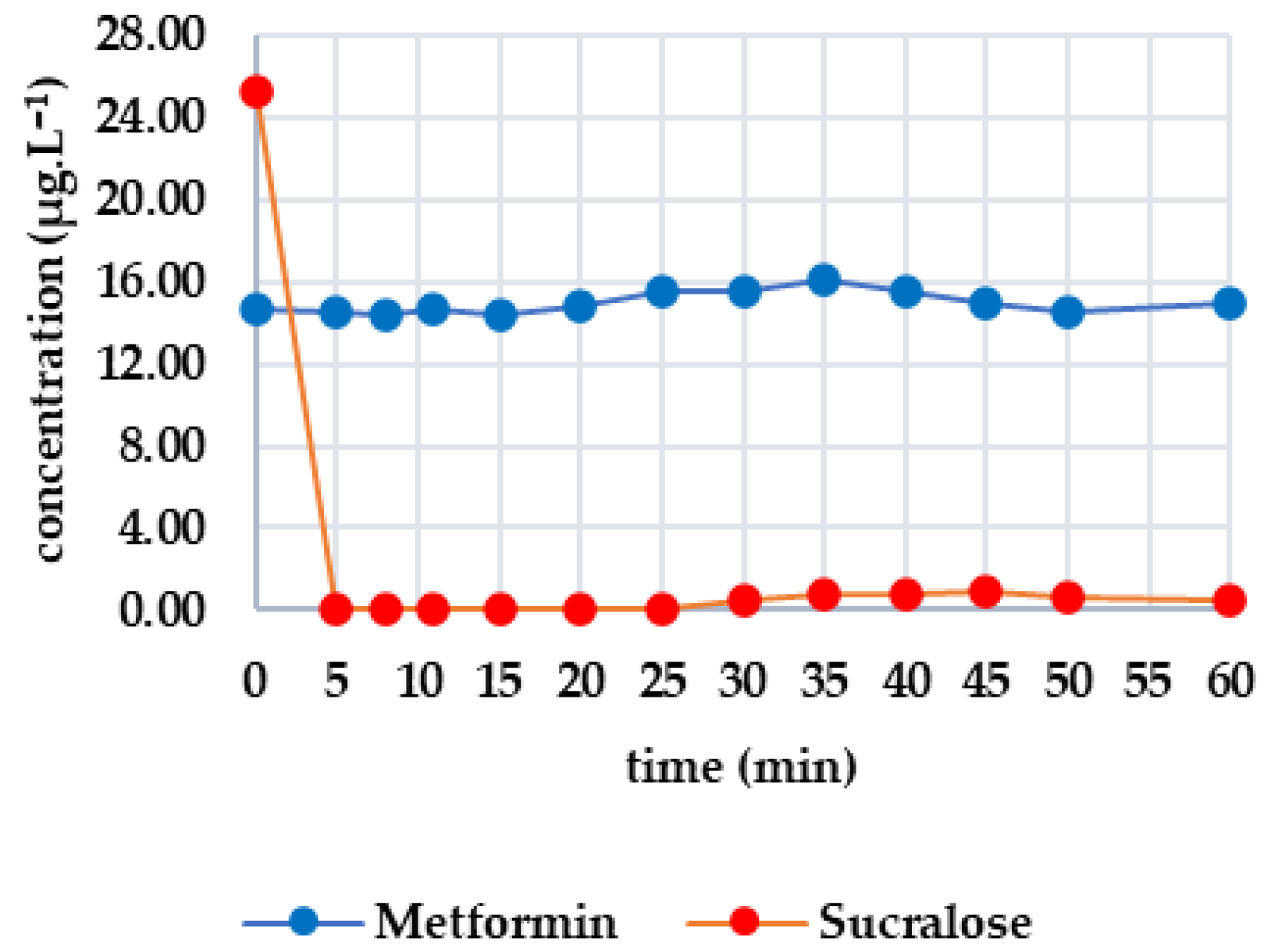 - Quintão, F.; Freitas, J.; Machado, C.; Aquino, S.; Silva, S.; Afonso, R. Characterization of metformin by-products under photolysis, photocatalysis, ozonation and chlorination by high performance liquid chromatography coupled to high-resolution mass spectrometry (HPLC/HRMS). Rapid Commun. Mass Spectrom. 2016, 30, 2419–2428. [Google Scholar] [CrossRef]