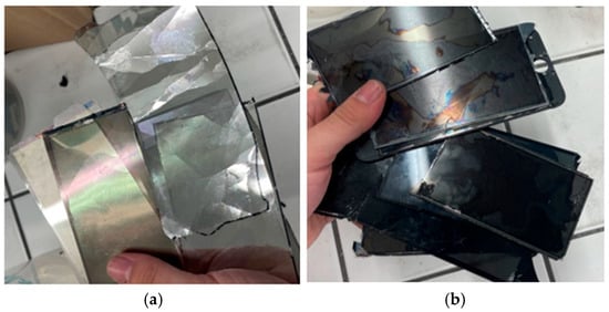 The input material for the experiment consisted of 67 LCD screens from mobile phones. The displays were manually disassembled to separate the layers containing the conductive transparent indium tin oxide (ITO) coating. This layer is typically deposited on the surface of two borosilicate glass plates, which form the basic structure of the display. In addition to the ITO layer, the internal space of the display also contains thin-film transistors and color pigments that create the image. Both glass plates are covered on the outside with a polarizing film that adheres tightly to the glass surface [21,22]. As part of the classification process, the separated layers were divided into two categories—Front Glass (FG) and Back Glass (BG), as shown in Figure 1. The FG layer is oriented toward the interior of the device and is typically attached to a transparent plastic film, whereas the BG layer forms the outer part of the touch surface and is adhered directly to the glass touch layer of the display.