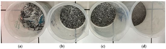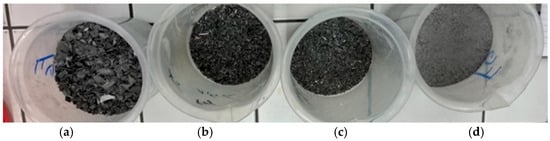 The mechanical processing of the material was carried out using a hammer mill LHM 20/16 (CONDUX-WERK, Mankato, MI, USA). This was followed by milling in a ball mill (LAC, MK Labor, Rajhrad, Czech Republic). The milled material was subjected to granulometric classification, resulting in four particle size fractions from both layers: <1 mm, 1–1.5 mm, 1.5–2 mm, and >2 mm, as shown in Figure 2 and Figure 3. For the experiment, only the <1 mm, 1–1.5 mm, and 1.5–2 mm fractions were used. The >2 mm fraction from both layers was excluded due to its size and the presence of residual materials such as glass, plastic films, and other components that could interfere with the bacterial life cycle.