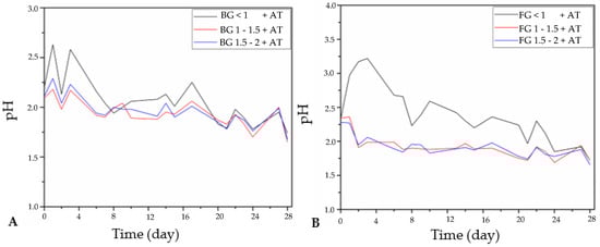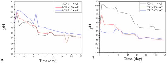 Changes in pH value during the leaching of BG (A) and FG (B) fractions with A. thiooxidans (AT).