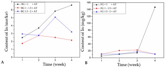 Amount of indium leached over 4 weeks in BG (A) and FG (B) fractions after leaching with A. ferrooxidans (AF).