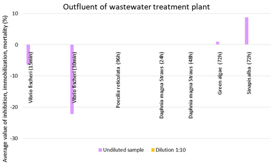 Average values of inhibition, immobilization, and mortality at the outfluent of the wastewater treatment plant.