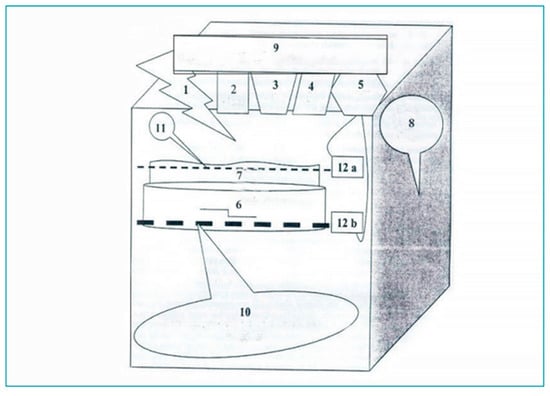 Technical design of the device for physical waste pre-treatment. Legend: 1, 2, 3, 4, 5—generators of force fields (spark discharge–high temperature plasma, microwave field, ultrasound, UV radiation, electrostatic field–non-thermal plasma), 6—plastic sample container, 7—sample ready to testing, 8—Faraday cage, 9—supporting bridge carrying generators 1–5, including their drives, switches, and circuit breakers, 10, 11—conductive metal grid, 12 a, b—HV supply cables connected to generator 5 (electrostatic field) (Reprinted from Refs. [20,21]).