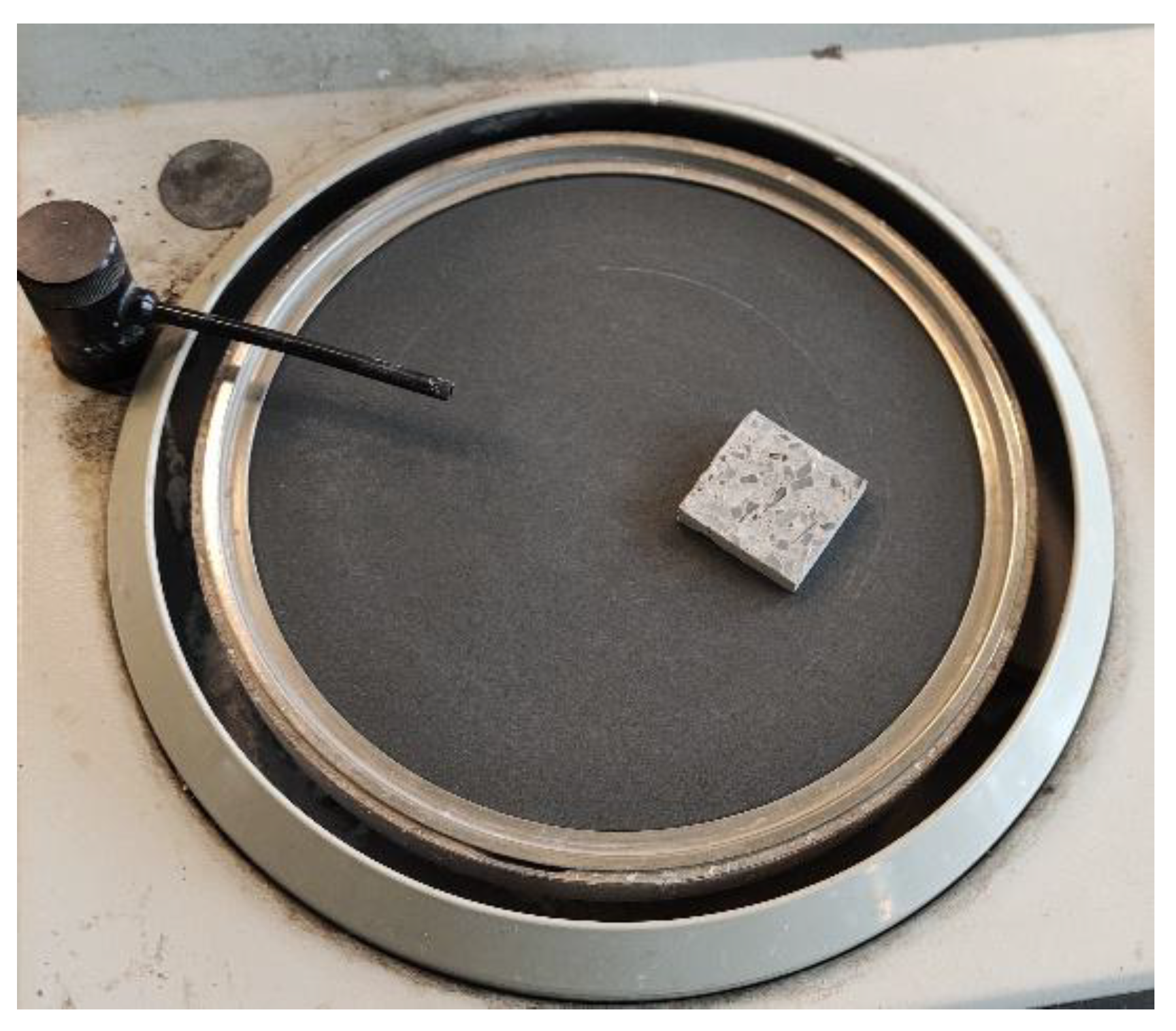 Specimens measuring 40 mm × 40 mm × 160 mm were cut using a Struers (Copenhagen, Denmark) Discoplan-TS diamond blade with continuous water cooling. This method produced clean cuts, free of dust and thermal degradation in the cutting zone. Surface finishing was performed in accordance with standards for petrographic analysis [