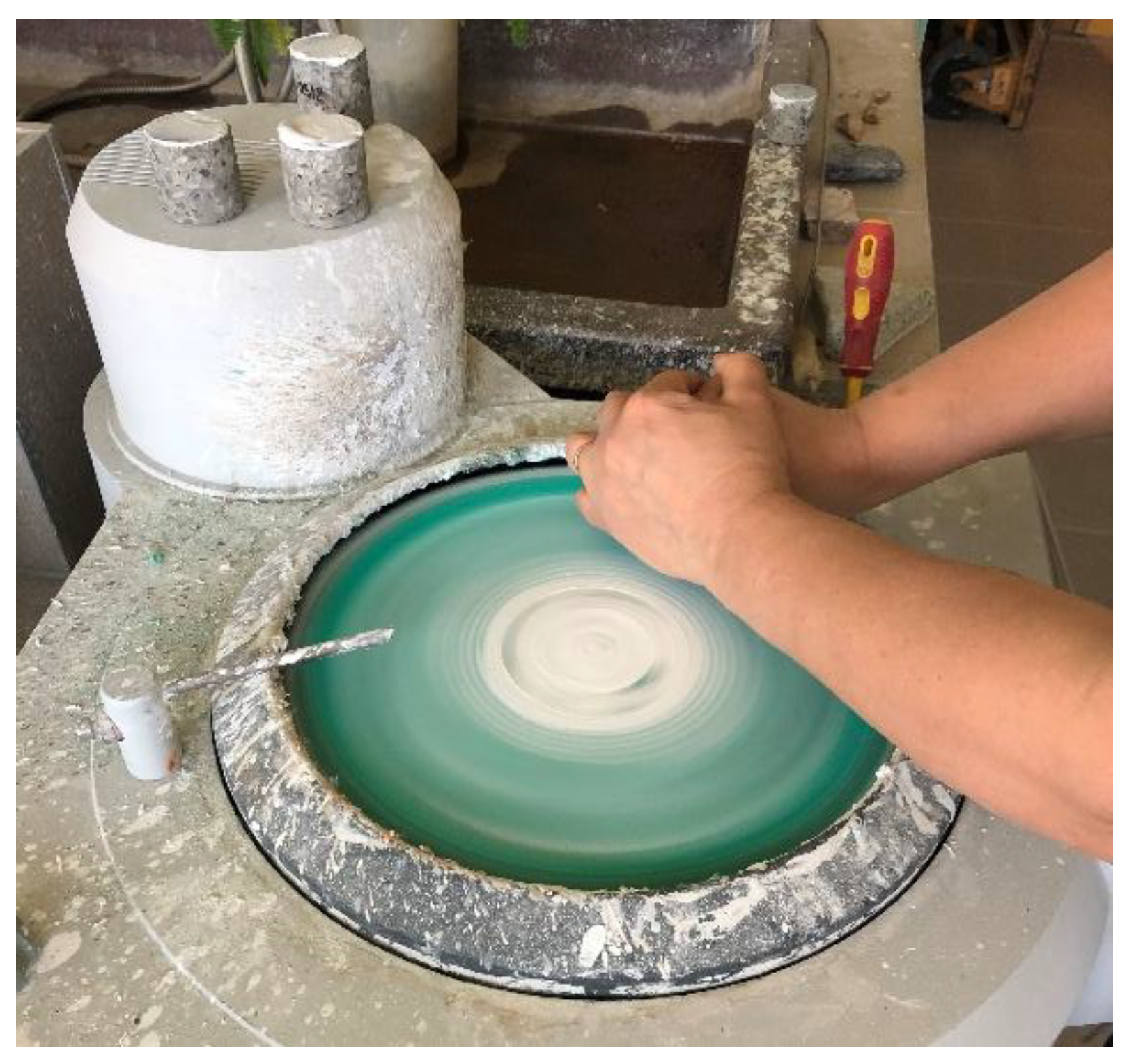 In the industrial setting, the surface finishing process was carried out in a custom-designed polishing chamber. Samples were placed into a box equipped with four abrasive belts and one stone polishing plate. To ensure uniform hardness during processing, each sample was wrapped in plastic and embedded in a gypsum mixture of medium to fast setting consistency (setting time: 24–48 h). After demolding, the sample was fixed between polishing arms that ensured a planar surface. The polishing process employed diamond discs with grit sizes ranging from 30 to 3000, using abrasives supplied by various manufacturers [