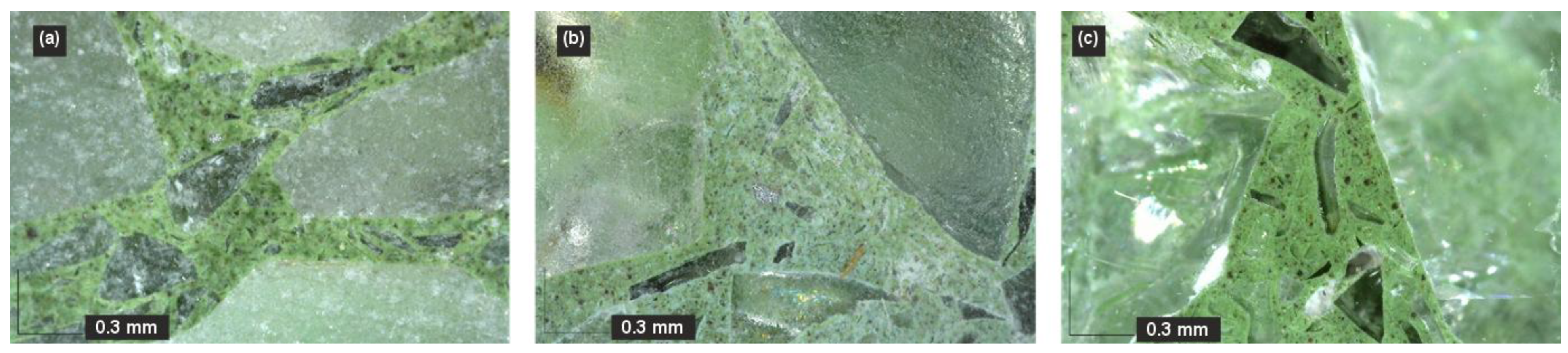 7]. As a result, alternative applications are being explored, especially in the construction industry. One well-established method involves incorporating recycled glass into cement matrices as a substitute for natural aggregate, contributing to the reduction in primary raw material consumption [