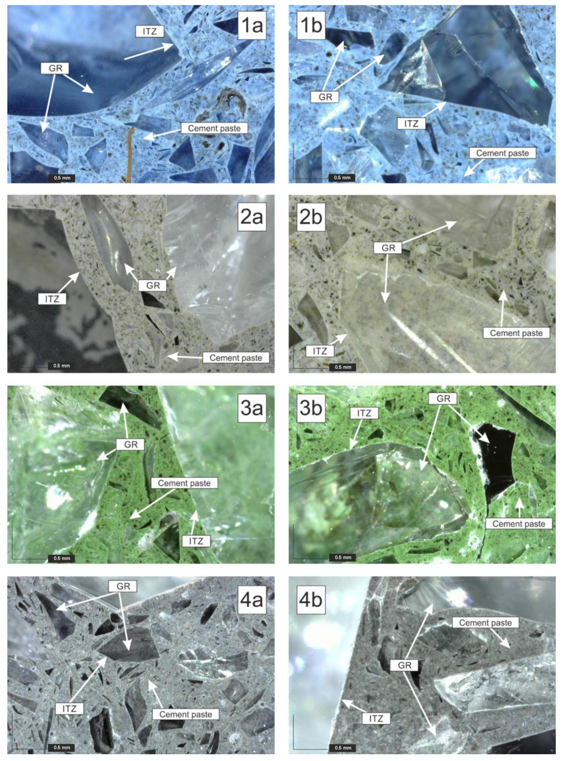 From a microstructural perspective, the smooth surface and well-defined interfacial transition zone (ITZ) between the glass particles and the cement paste (