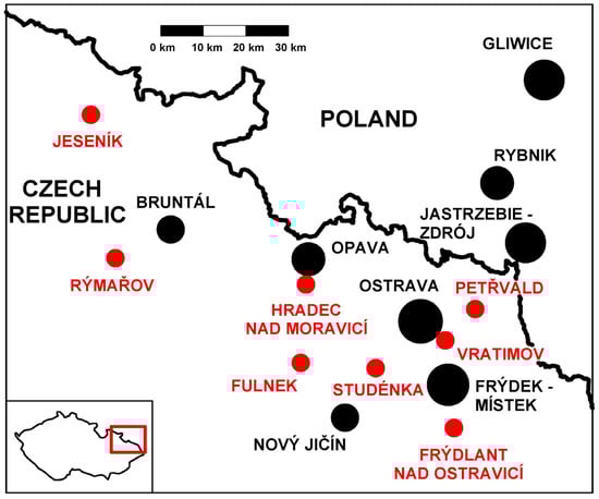 - Petřvald—a town in Karviná district with approximately 7500 inhabitants, situated east of the city of Ostrava, i.e., on the windward side. The town lies in an area that has been more damaged by mining and industry in the past. In general, it is a town with lower recreational potential, lower housing demand, and lower real estate prices [32];