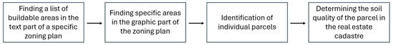 Each of the towns defines new buildable areas in its zoning plan, the list of which is always given in the text part of the document [27,28,29,30,31,32,33,34]. It should be emphasized that for research, only free buildable areas designated for individual housing were analyzed; land that is registered as buildable in zoning plans but is clearly already built up was not taken into consideration. The zoning plans were therefore analyzed, the listed areas were found in the map, the individual parcels on which the developable areas lie were identified, and the creditworthiness of the parcels concerned was verified. This can be determined directly on the cadastral map by clicking on the relevant parcel. If a specific parcel belongs to multiple soil quality classes, each piece of data is recorded separately, i.e., each part of the total area is assigned a specific soil quality class. The areas of entire parcels and any parts with different soil quality are listed directly in the real estate cadaster. If a specific area was registered in the zoning plan as buildable but was not part of the agricultural land fund, it was assigned the attribute “No SQ.” In the land registry, such areas are usually listed as “barren land” or “other areas.” For each city, the total area of all buildable land was also calculated. The procedure is clear from Figure 3.