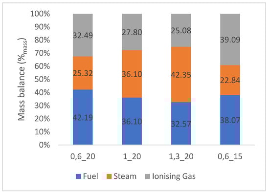 Mass flow measurements enabled the construction of mass balances (Figure 5). Ionization gas input was highest in test 0,6_15 due to reduced fuel/steam flow.