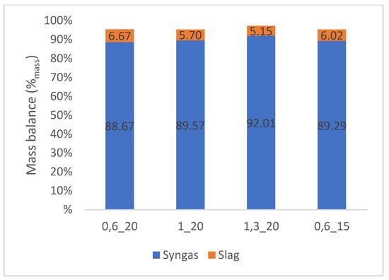 The mass balance of input materials and products showed a high yield of syngas, which reached up to 92% by volume.