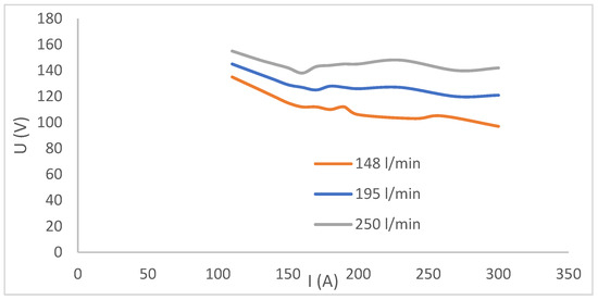 Figure 7 shows voltammograms at nitrogen flow rates of 148, 195, and 250 L/min. Voltage rose with increasing flow at the same current. All curves show voltage drop with increasing current, then stabilization—typical behavior linked to arc temperature and plasma conductivity [23,24,25,26].