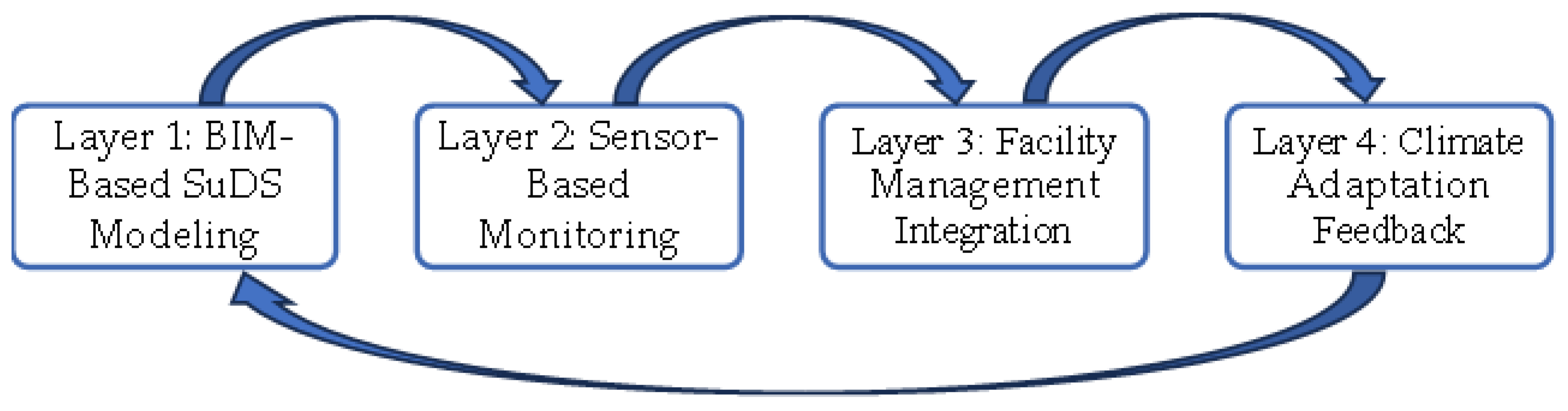 This study presents a robust digital framework that integrates BIM and FM technologies to enhance the design, monitoring, and adaptation of SuDS. Each of the four layers plays a vital role in transitioning SuDS from static systems to intelligent, adaptive infrastructure. Cities striving for resilience must adopt such digital paradigms to address the growing challenges posed by urbanization and climate variability.