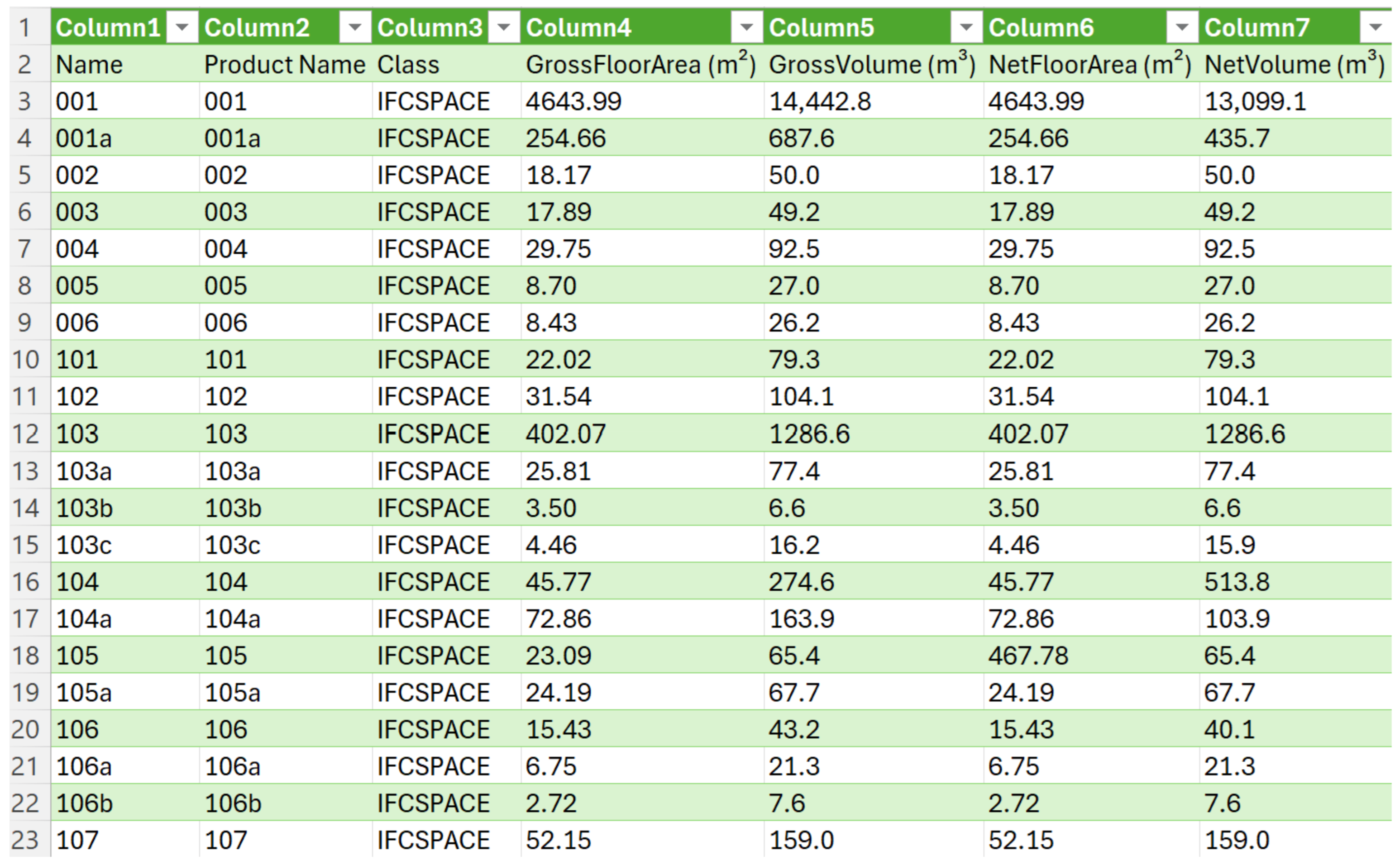 Figure 3. Example of space evidence—data exported from digital model and imported to table editor (Microsoft® Excel® for Microsoft 365 MSO (Version 2509 Build 16.0.19231.20246) 64 bit).