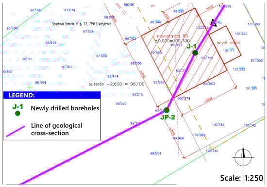 For a detailed interpretation of the results, a core drilling survey was essential. Two boreholes, J-1 and JP-2, were carried out near the planned construction site (Figure 5). The boreholes were drilled using core drilling methods to depths of 4 m (J-1) and 5 m (JP-2). An infiltration test was also performed in borehole JP-2.
