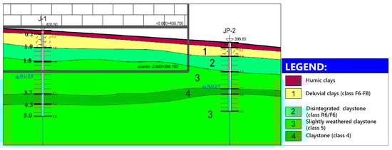 Based on the collected data, a conceptual geological cross-section was developed, enabling a more accurate interpretation of the results from the dynamic penetration tests. The following figure (Figure 6) presents a detailed excerpt of this documentation, focusing on the area surrounding both completed boreholes to enhance clarity.