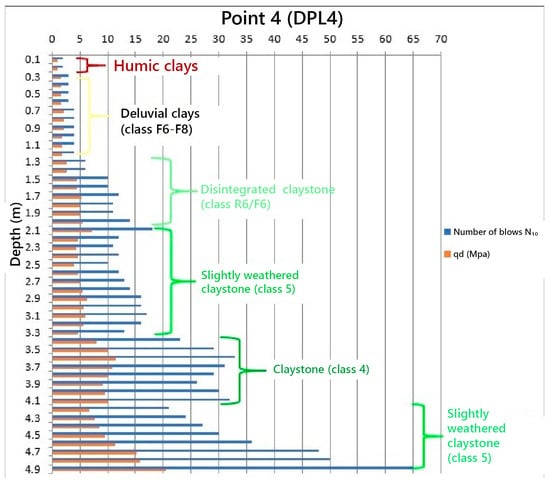 From a depth of 3.3 m, a layer with the highest dynamic resistance values becomes apparent. It was identified through borehole investigation as a more compact claystone (class 4) within the interval of 3.7–4.3 m. The DPL measurement indicated this layer slightly higher, approximately between 3.3 and 4.1 m, while the thickness of the layer corresponded with that observed in the borehole profile.