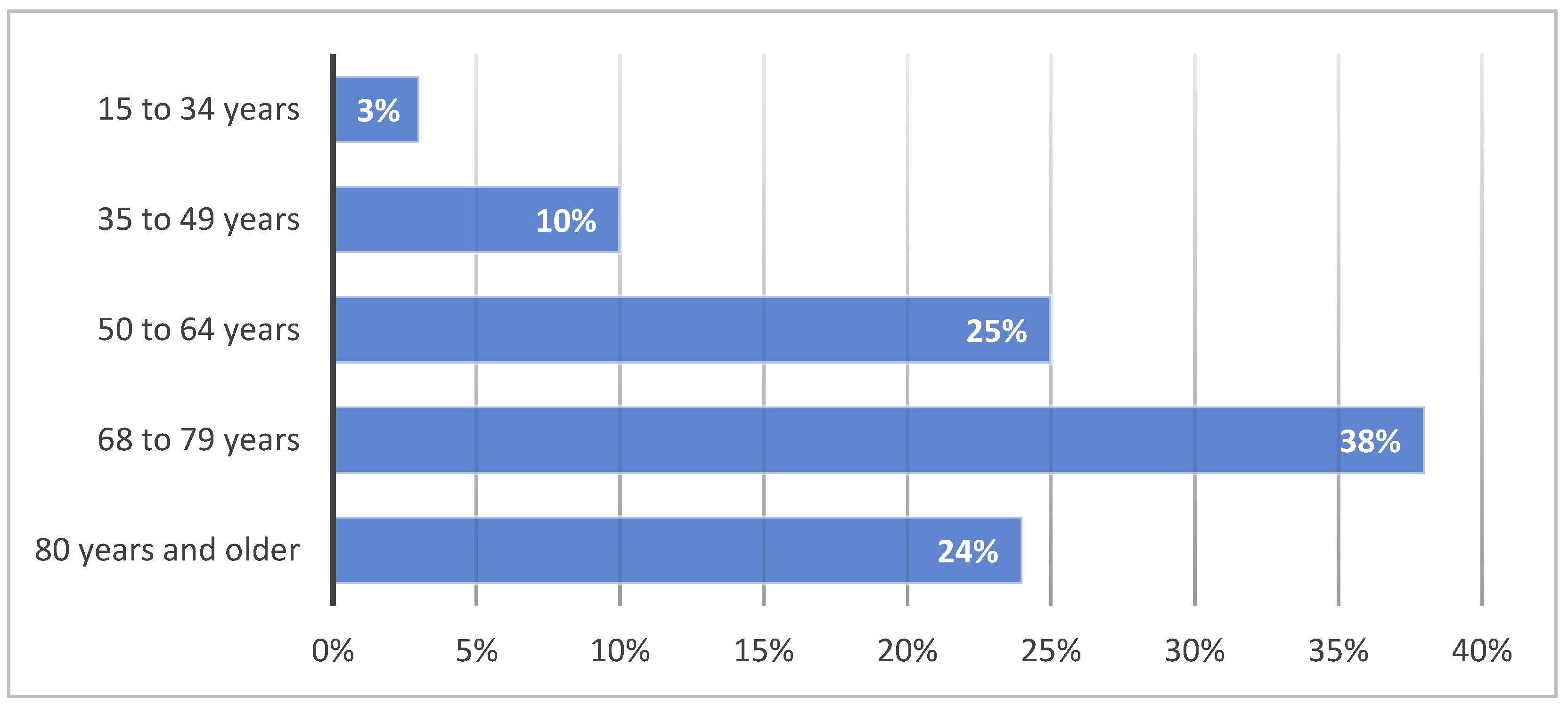 The largest proportion of people with mobility impairments encompasses the 68–79-year-old age group, accounting for 38% of the total, followed by the 50–64-year-old age group, accounting for 25% of the total, and the 80-and-over age group, accounting for 24% of the total. Almost 90% (87% to be precise) of people with mobility impairments are over 50 years of age, which indicates a strong correlation between age and the occurrence of mobility limitations, see