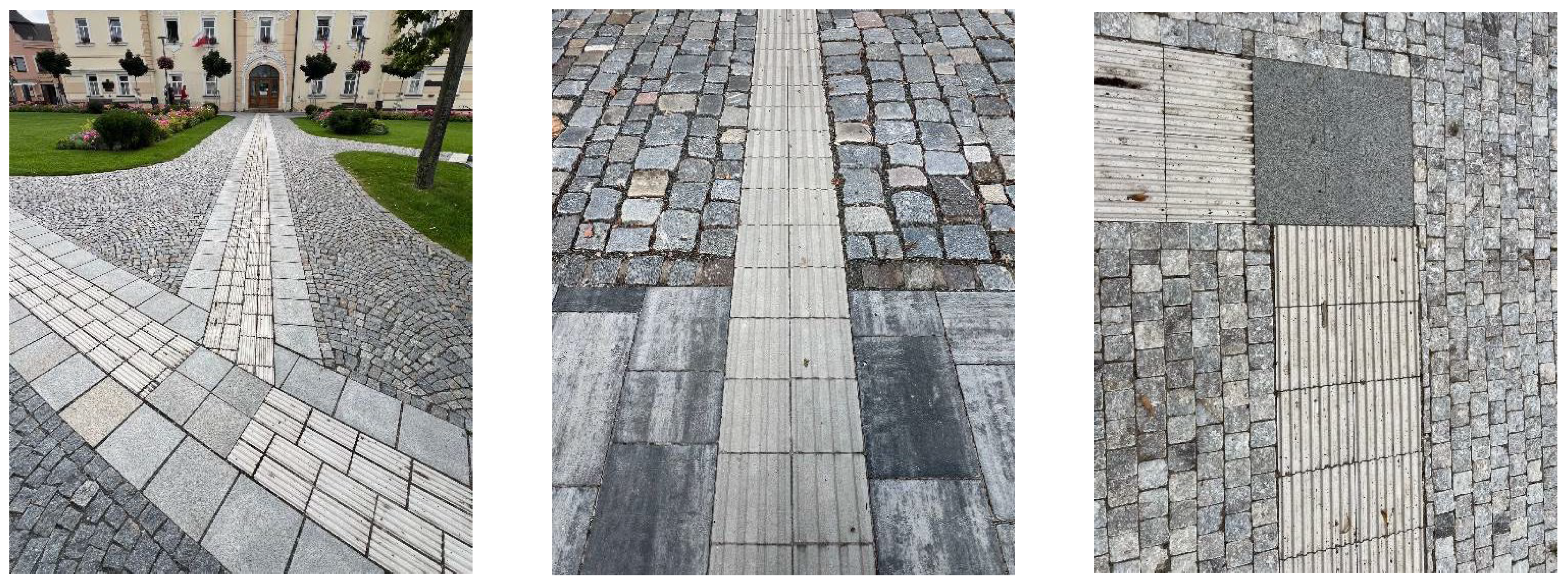For mobility impairments, the main problem is physical barriers—significant height differences, large longitudinal or transverse slopes of walking surfaces, insufficient passage and maneuvering space, control elements located out of reach, etc. In the case of visual sensory impairments, the main problem is the lack and ambiguity of information about the building and its surroundings obtained non-visually, i.e., tactilely, mainly using a long white cane, and acoustically in changing situations.