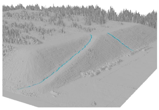 Discharge profiles were selected at the largest gullies (red dots in Figure 5). In the north, runoff is diverted via ruts formed by vehicle tracks that run along the perimeter of the upper platform.