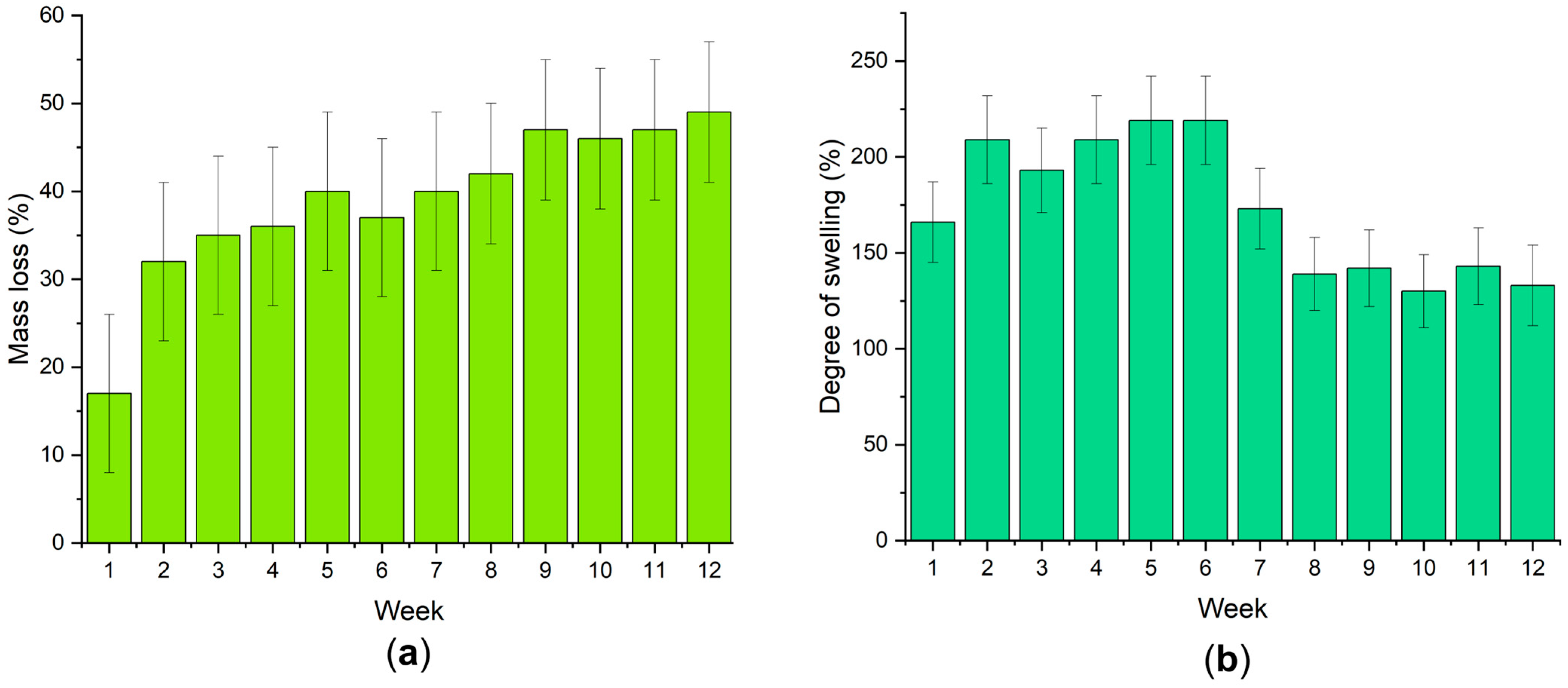 - Dias, J.R.; Sousa, A.; Augusto, A.; Bartolo, P.J.; Granja, P.L. Electrospun Polycaprolactone (PCL) Degradation: An In Vitro and In Vivo Study. Polymers 2022, 14, 3397. [Google Scholar] [CrossRef] [PubMed]