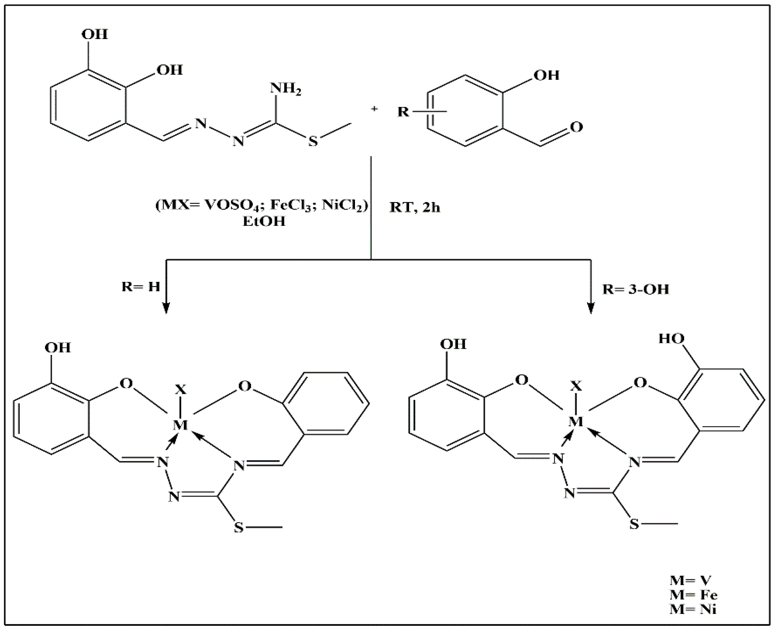 Bal-Demirci et al. reported 3-hydroxysalicylaldehyde-S-methylthiosemicarbazone and their VO(IV), Fe(III), Ni(II) complexes (Figure 2). The parent ligand and its complexes have been evaluated for their antioxidant and Reactive Oxygen Species (ROS) radical scavenging activities. The Fe(III) complex showed superior antioxidant activity, while the complexes of Fe(III) and V(IV) demonstrated higher ROS scavenging properties than the free ligand [11].