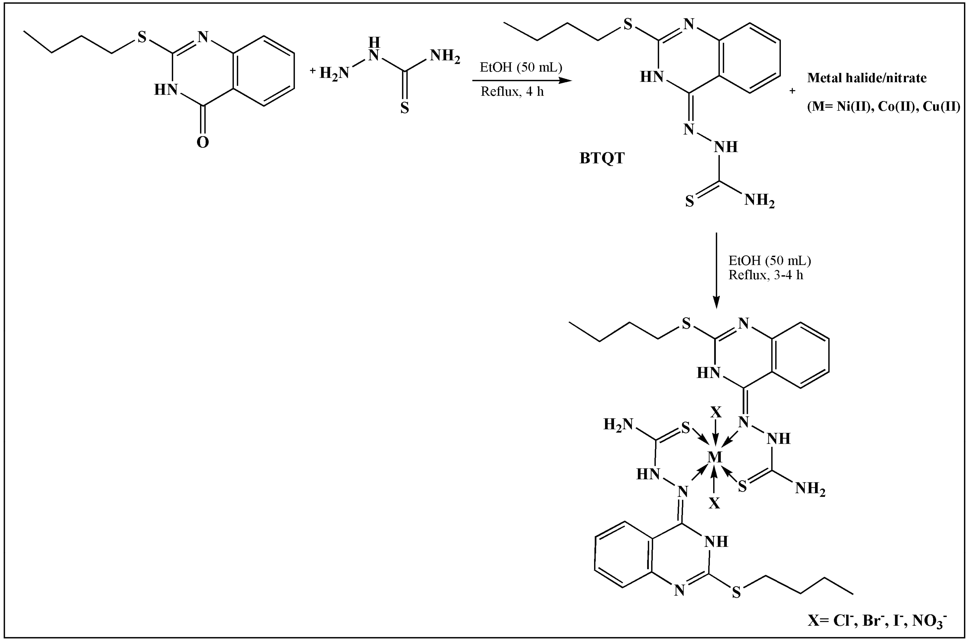 In another study, Rai et al. also reported 2-butyl thioquinazoline-4-(3H)-thiosemicarbazone (BTQT) ligand and their Co(II), Ni(II), and Cu(II) complexes (Figure 5). The antimicrobial activity of the ligand and complexes was tested against C. albicans and E. coli. Antimicrobial activity showed that the metal complexes have higher activity than the free ligand [14]. Some TSC metal complexes and their biological applications are depicted in Table 1.