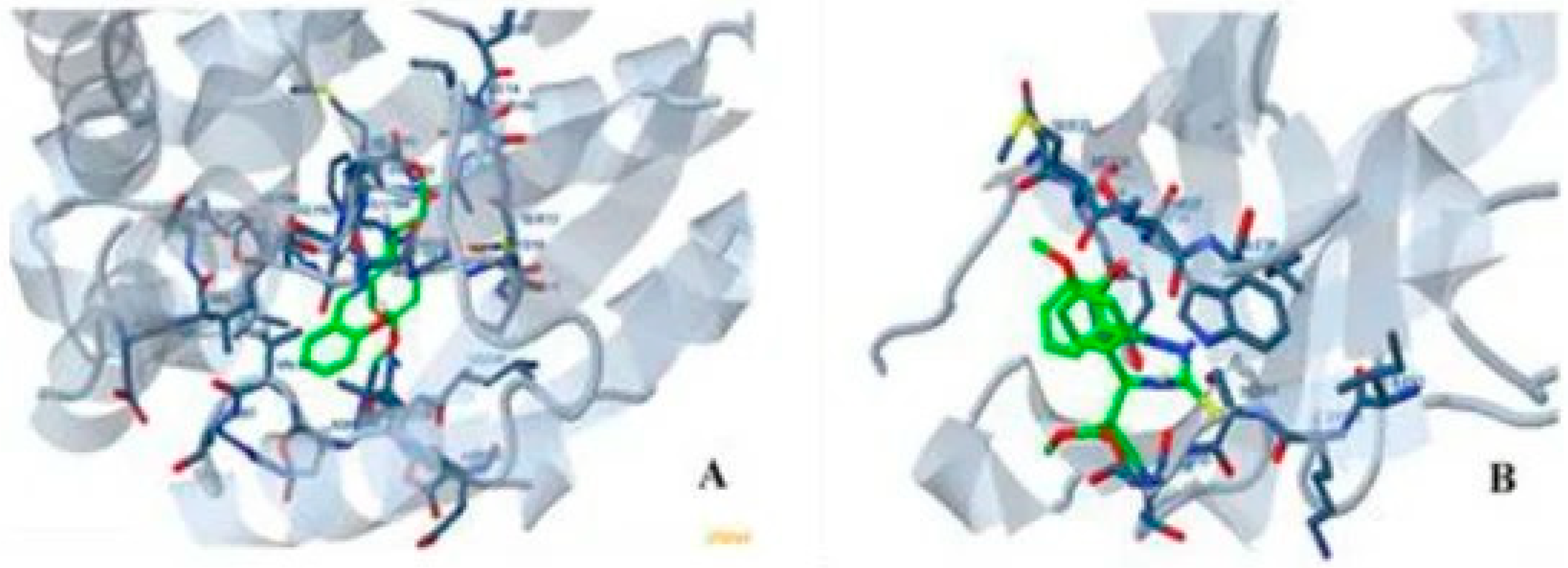 Figure 6. MTSC ligand 3D molecular docking against (A) 3hb5-oxidoreductase protein and (B) speckle-type POZ protein (SPOP)-binding protein.
