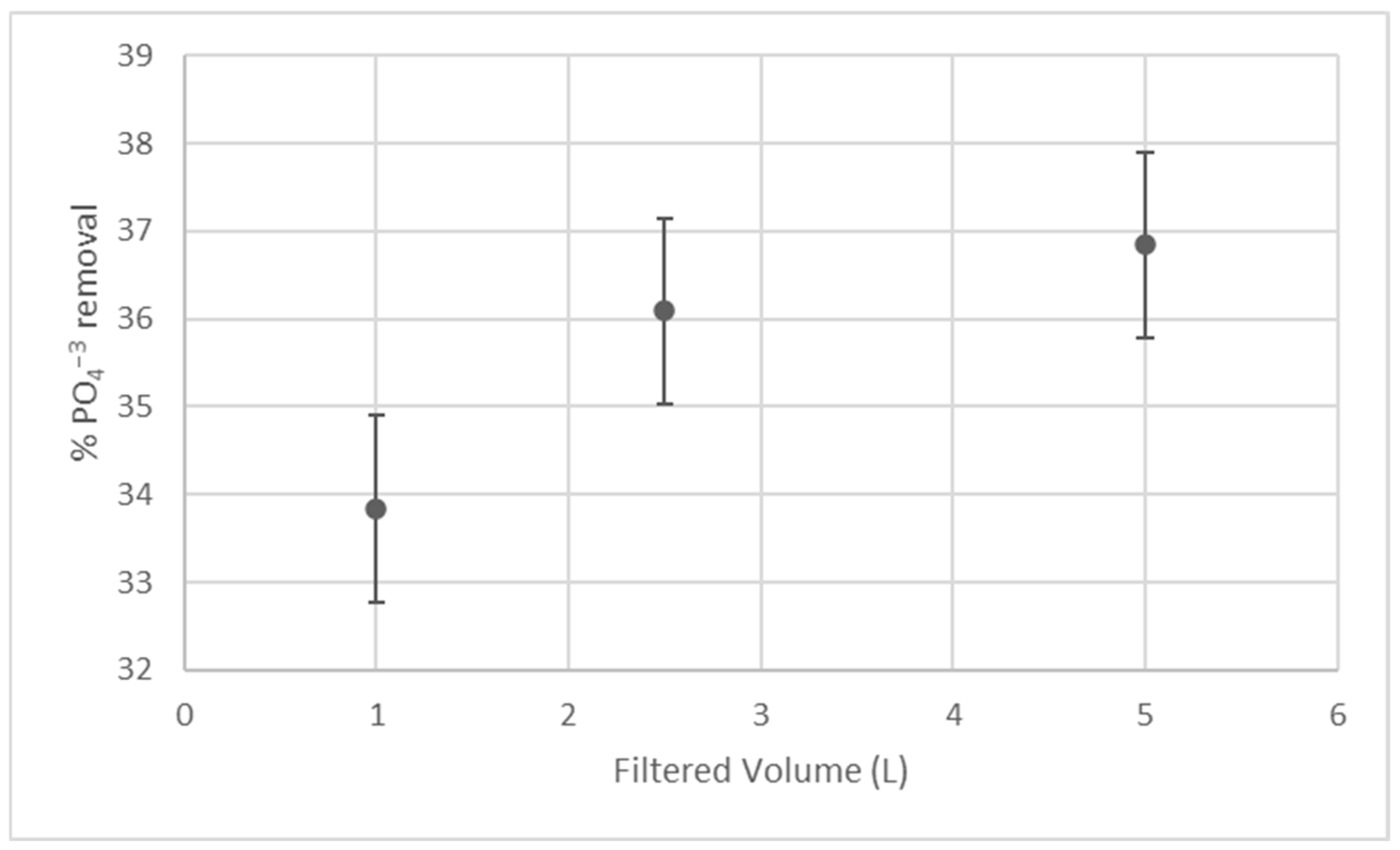 Sacha Inchi bioadsorbent, facilitating rapid adsorption and precipitation of phosphate. As filtration continues and additional volumes of contaminated water are processed, these reactive sites become increasingly occupied or partially saturated, leading to a gradual decline or stabilization in removal efficiency as the filtered volume increases. This behavior is typical of fixed-bed filtration systems operating in continuous flow, where mass transfer limitations and the reduced availability of active sites influence performance over time. The observed trend suggests that phosphate removal is governed by the availability of surface sites rather than hydraulic instability, confirming that the system maintains a constant but finite adsorption capacity during single-pass operation.