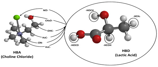 The higher occupied molecular orbital (HOMO) energy indicates the molecular power of the molecule to donate electrons in line with the literature reports [17,18]. Lactic acid (LAC) shows a HOMO energy of −10.18 eV, while choline chloride (CHL) exhibits −7.83 eV, as shown in Table 1. The lower HOMO energy of LAC indicates a stronger tendency to donate electrons, which agrees with Refs. [19,20]. The lower unoccupied molecular orbital (LUMO) energy determines the ability to accept electrons in the context of molecular orbital theory. LAC has a LUMO energy of 0.99 eV, while CHL presents 3.04 eV. This indicates that LAC can also act as an electron acceptor at the LUMO level, which is consistent with recent density functional theory (DFT) studies showing that LAC contributes both donor and acceptor roles in DES formations [19].