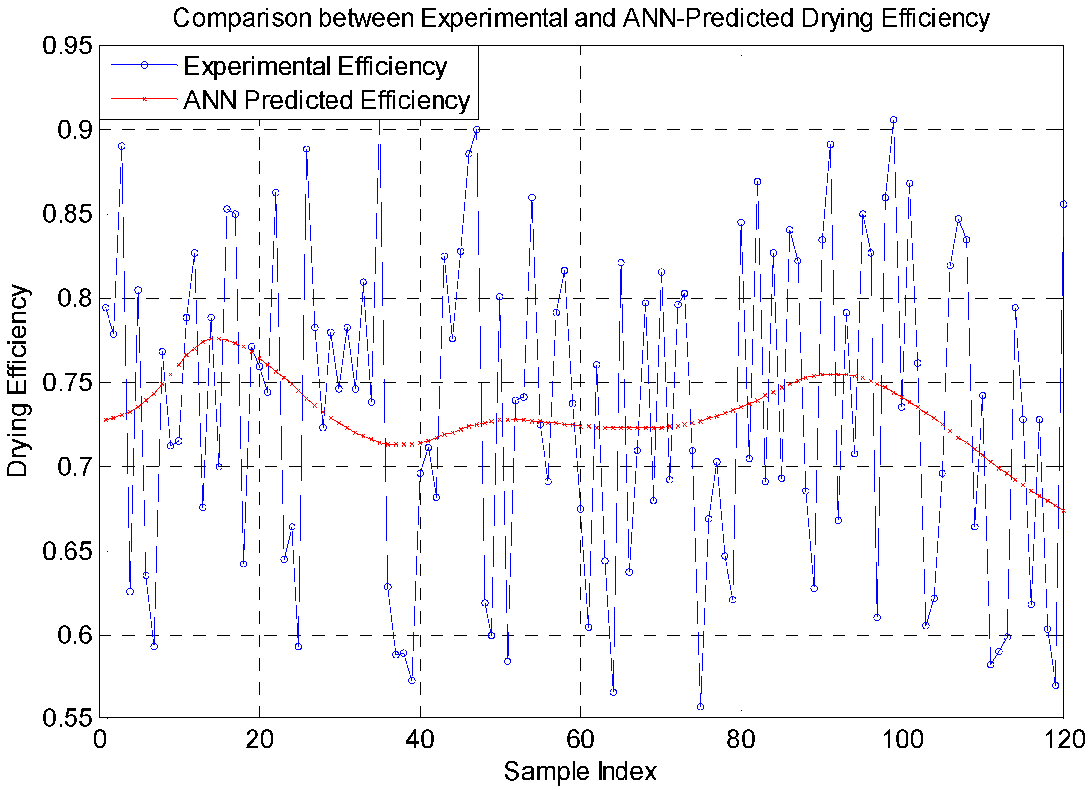 A time-series comparison between the experimentally measured drying efficiency and ANN-predicted values is presented in