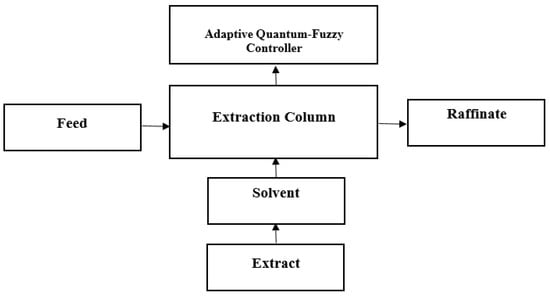 Figure 1 analyzed in this study, showing the main material flows (feed, solvent, extract, and raffinate) and the adaptive quantum-fuzzy controller regulating the column operation.