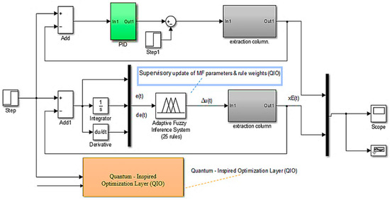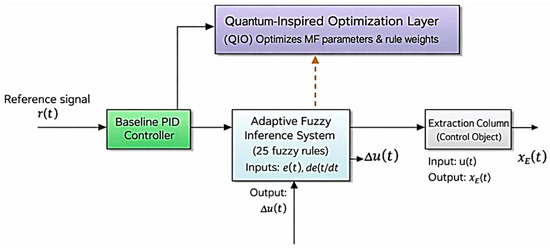 Based on the above quantum-inspired optimization principles, the overall control architecture is structured as a hierarchical supervisory system. The conceptual functional layout of the proposed quantum-inspired fuzzy control strategy is illustrated in Figure 3. In this architecture, the quantum-inspired optimization layer does not directly generate control signals; instead, it supervises the adaptive fuzzy inference system by continuously updating membership-function parameters and fuzzy rule weights, while the baseline PID controller ensures primary stabilization of the extraction process.