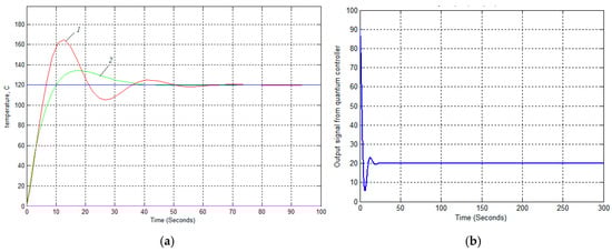 Graph of the transient process of the hybrid automatic control system: (a) 1—Classic PID controller; 2—quantum fuzzy controller; (b) control signal generated by the quantum controller.