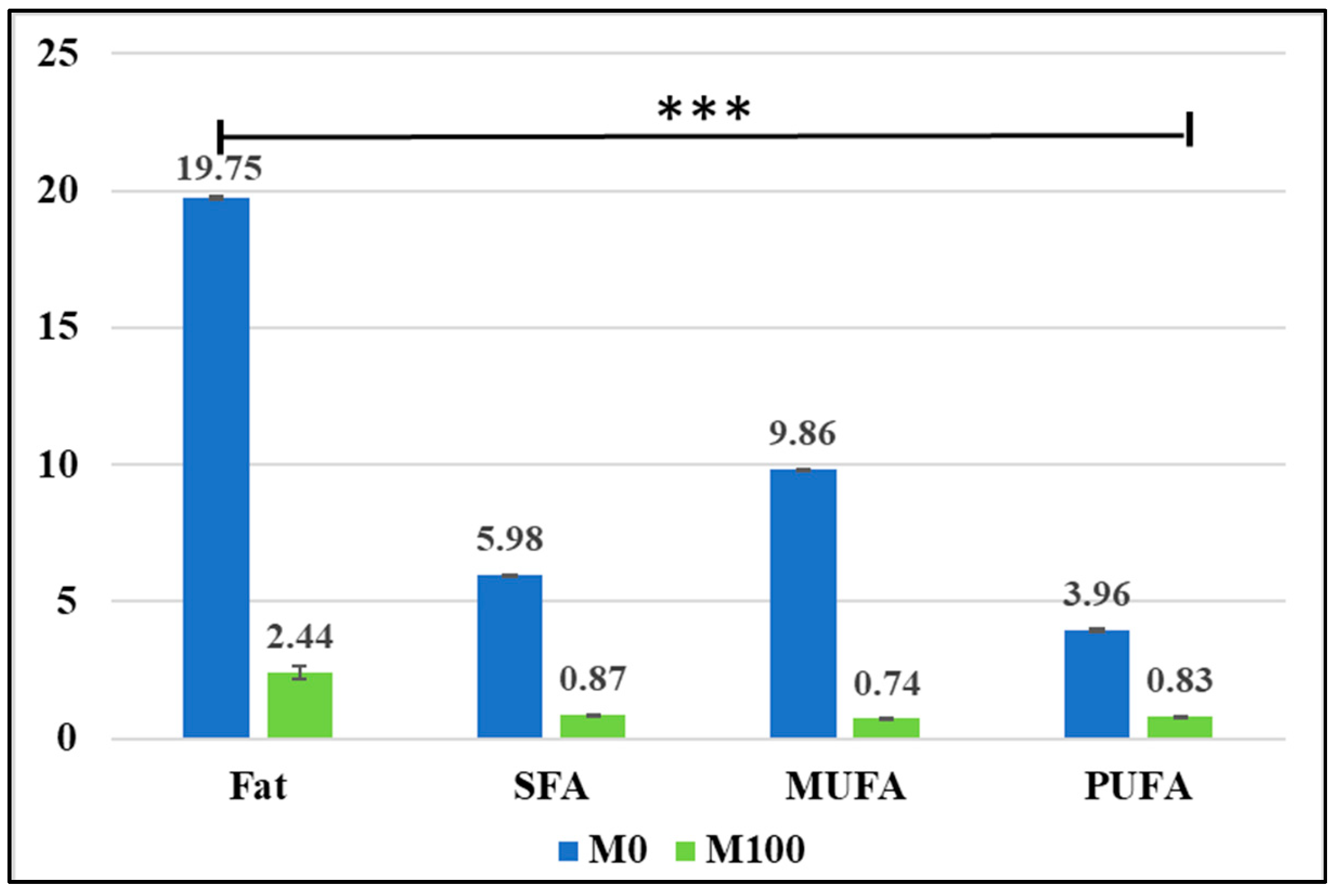 | Fatty Acids | M0 (g/100 g) | M100 (g/100 g) | p-Value |