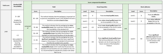 Assessment criteria for recyclability of impregnated papers through different scores [14].