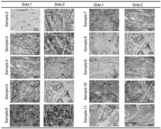 Microscopic evaluation of impregnated papers with different types of biowax: side 1 (impregnated side) and side 2 (non-impregnated side).