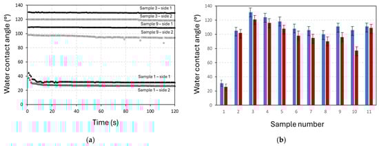Water contact angles as an indication of hydrophobic barrier performance of biowax-impregnated papers: (a) illustration of water contact angles measured over time after deposition of a 3 µL droplet; (b) stabilized static water contact angle on side 1 (blue bar) and side 2 (red bar).