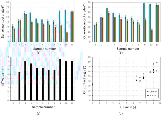 Oil contact angles and fat resistance of biowax-impregnated papers,: (a) sun oil contact angles on side 1 (green bar) and side 2 (brown bar); (b) olive oil contact angles on side 1 (green bar) and side 2 (brown bar); (c) KIT values; (d) relation between oil contact angles and KIT values.