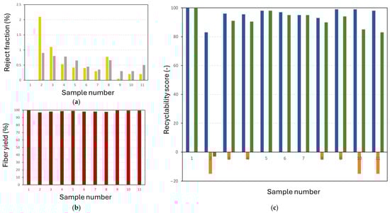 Results of recyclability assessment with indication of parameters resulting from the testing protocol: (a) fraction of coarse rejects (CRs, yellow) and fine rejects (FRs, gray); (b) fiber yield Y; (c) recyclability scores, including yield score (blue), visual impurity score (VI, orange), and technical recyclability score (T, green).
