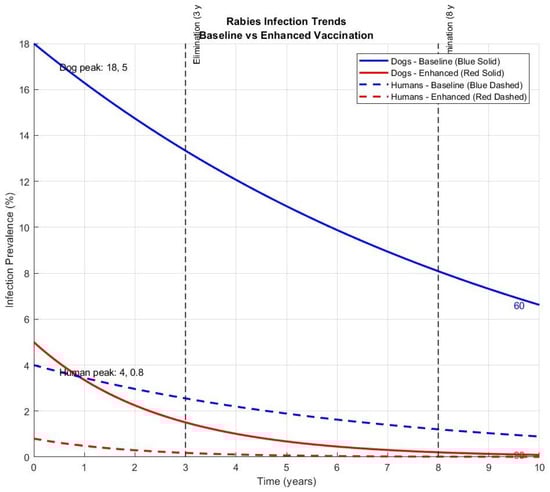 To evaluate the epidemiological consequences of pharmaceutical enhancement in rabies control, numerical simulations of the coupled dog–human system were conducted. The model equations were integrated numerically using the classical fourth-order Runge–Kutta scheme with a daily time step, under two distinct immunization regimes: