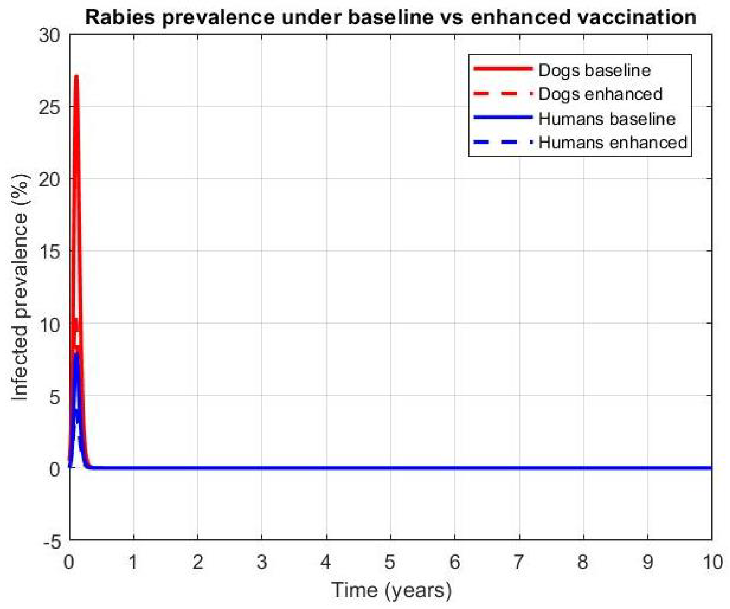 - The peak infection in dogs decreases from approximately 18% under conventional vaccination to 5% under enhanced vaccination.
