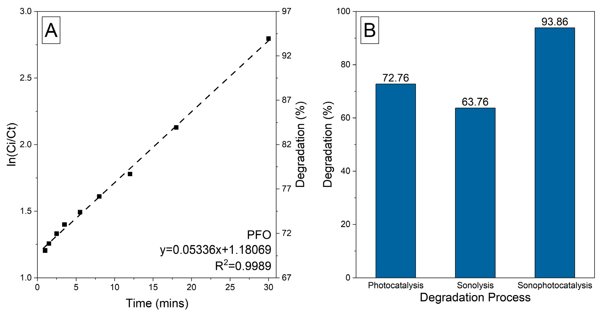 3.4. Comparison of Sonolysis, Photocatalysis, and Sonophotocatalysis