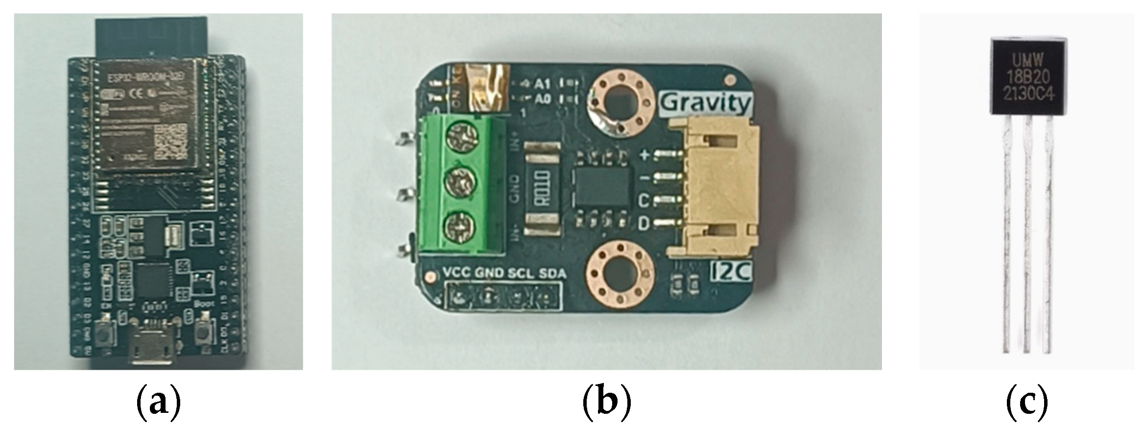 - DS18B20 Programmable Resolution 1-Wire Digital Thermometer Datasheet. Available online: https://cdn.sparkfun.com/datasheets/Sensors/Temp/DS18B20.pdf (accessed on 6 August 2025).