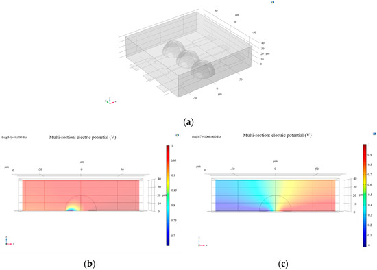 At the same frequency of 10,000 Hz, the calculated results are shown in Figure 2. It can be observed that the electric potential distribution across the electrode array with living cells does not exhibit a significant gradient, indicating that the cell membranes were not disrupted at this frequency. In contrast, for a single living cell at the same frequency, the potential distribution displays a clear gradient, suggesting that 10,000 Hz is sufficient to disrupt the membrane of an individual cell.