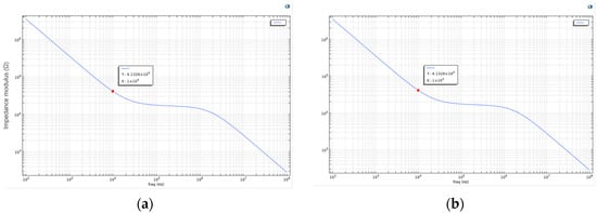 To simulate cell death, the membrane conductivity parameter Sig_memb was further modified to 1.2. The recalculated result is shown in Figure 3. The two Bode plots show no significant difference in general frequency response. However, at specific frequency points (e.g., 61,359 Hz), the plot reveals a critical interaction point between the electrode and the cell membrane. At this point, a balance is reached between the electrode’s influence and the bioelectrical properties of the cell. This frequency may also serve as an indicator of changes in membrane permeability, suggesting the onset of irreversible membrane damage or alteration.